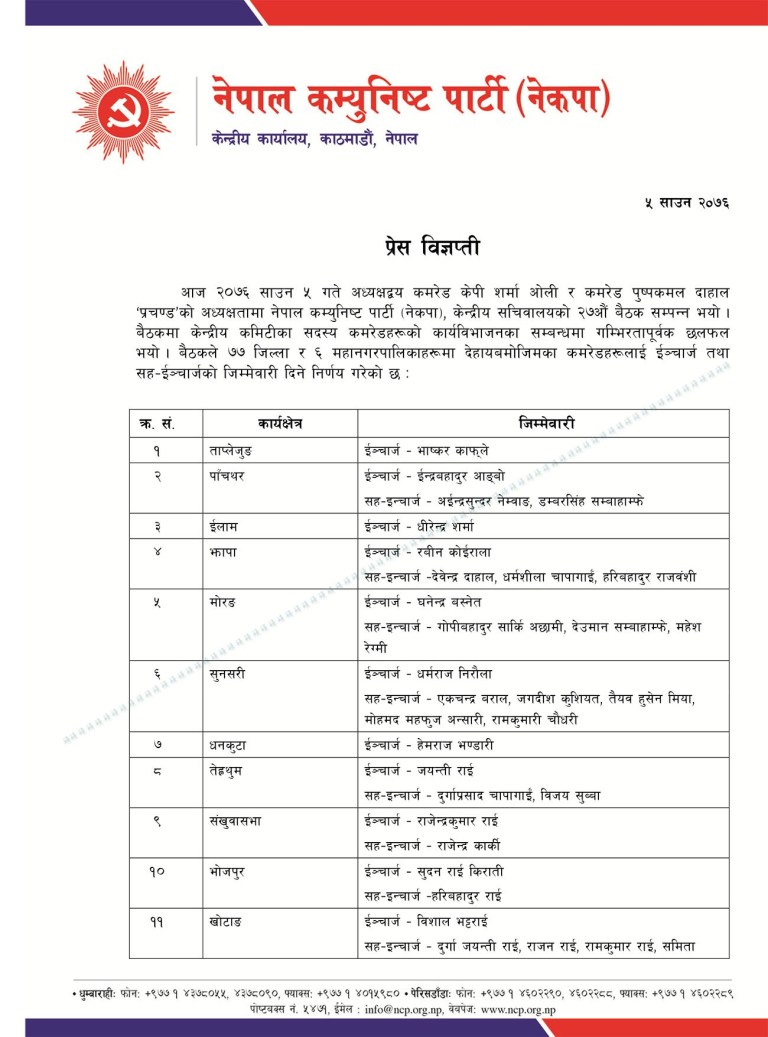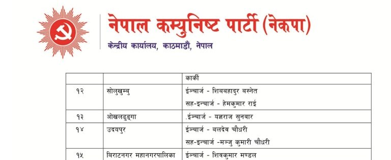 नेकपाको आइतबार बसेको सचिवालयले देशैभरिका इन्चार्ज र सह–इन्चार्ज तथा महानगरपालिका इन्चार्जको जिम्मेवारी बाँडफाट गरेको हो । इलाम जिल्लाका इन्चार्ज रमणलाई तोके पनि सह–इन्चार्ज भने तोकेको छैन ।