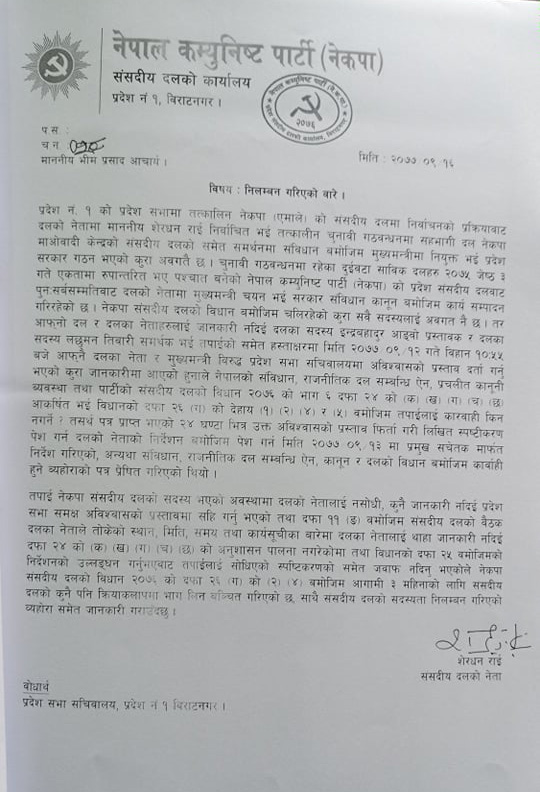 नेकपाका प्रमुख सचेतक वुद्धिकुमार राजभण्डारीका अनुसार मुख्यमन्त्रीविरूद्ध अविश्वासको प्रस्तावमा हस्ताक्षर गर्नेमध्ये १९ जनालाई स्पष्टिकरण सोधिएकोमा १५ जनालाई निलम्बन गरिएको हो।