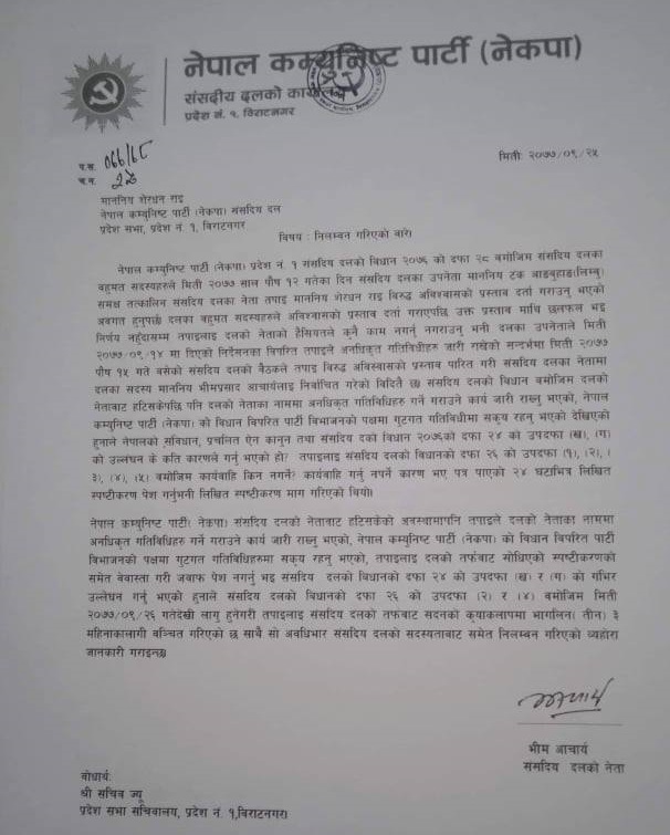 दलको कुनै पनि बैठकमा उपस्थित नभएर पार्टी र सरकारको हित विपरीत गतिविधिमा संलग्न रहेकाले उनीहरुलाई कुनै पनि गतिविधिमा संलग्न नहुने गरी नेकपाको संसदीय दलको विधान २०७६ बमोजिम तीन महिनाका लागि निलम्बन गरेको विज्ञप्तिमा उल्लेख छ ।