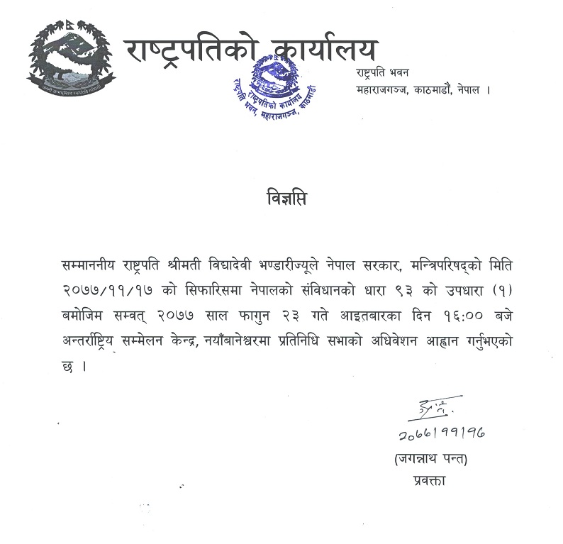 मन्त्रिपरिषद्को सिफारिस अनुसार राष्ट्रपति भण्डारीले २३ गते दिउँसो चार बजेको लागि बैठक आह्वान गरेकी हुन् ।
