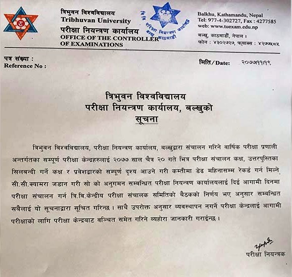 काठमाडौँ । त्रिभुवन विश्वविद्यालयले परीक्षा केन्द्रहरुमा सीसी क्यामेरा जडान गर्ने भएको छ। विश्वविद्यालयले आगामी चैत २० भित्र अनिवार्यरूपमा सीसी क्यामेरा जडान गरिसक्न परीक्षा केन्द्रहरूलाई निर्देशन दिएको हो।