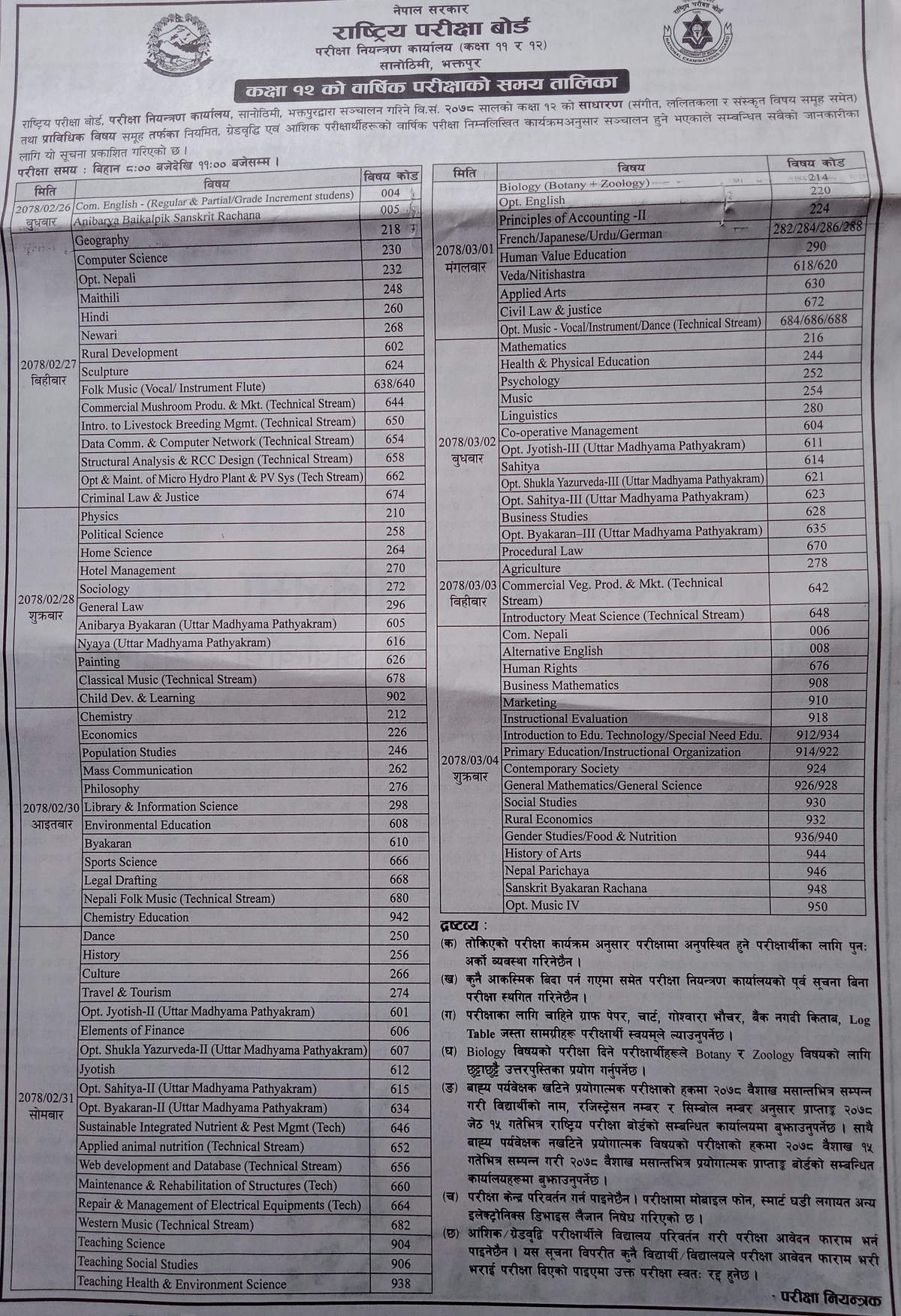 यस्तै, जेठ २६ गतेदेखि असार ४ गतेसम्म हुने १२ कक्षाको परीक्षाको तालिका पनि सार्वजनिक भएको छ । परीक्षा बिहान ८ बजेदेखि ११ बजेसम्म हुनेछ ।