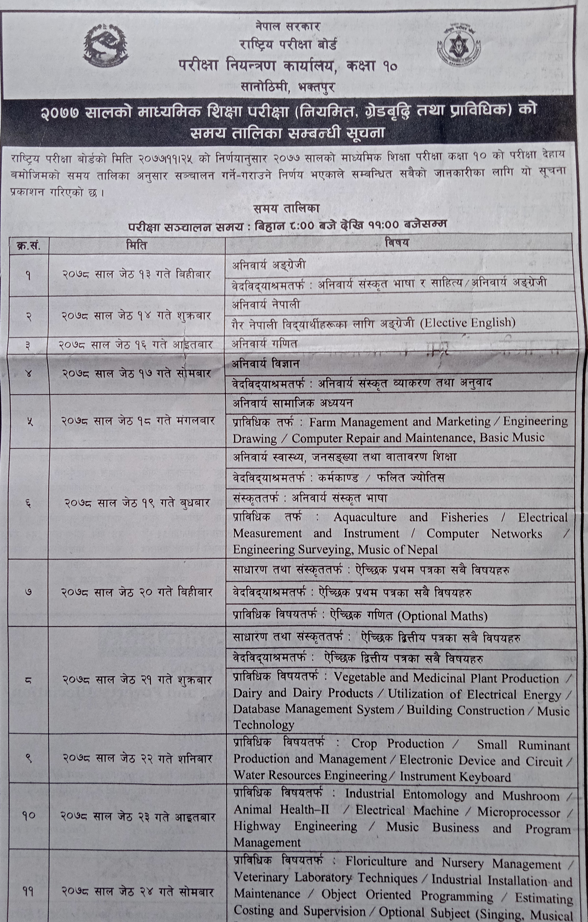 काठमाण्डौ । आउँदो जेठमा हुने एसईई र कक्षा १२ को परीक्षा तालिका सार्वजनिक भएको छ । २०७७ सालको माध्यमिक शिक्षा परीक्षा एसईई जेठ १३ गतेदेखि २४ गतेसम्म हुँदैछ ।