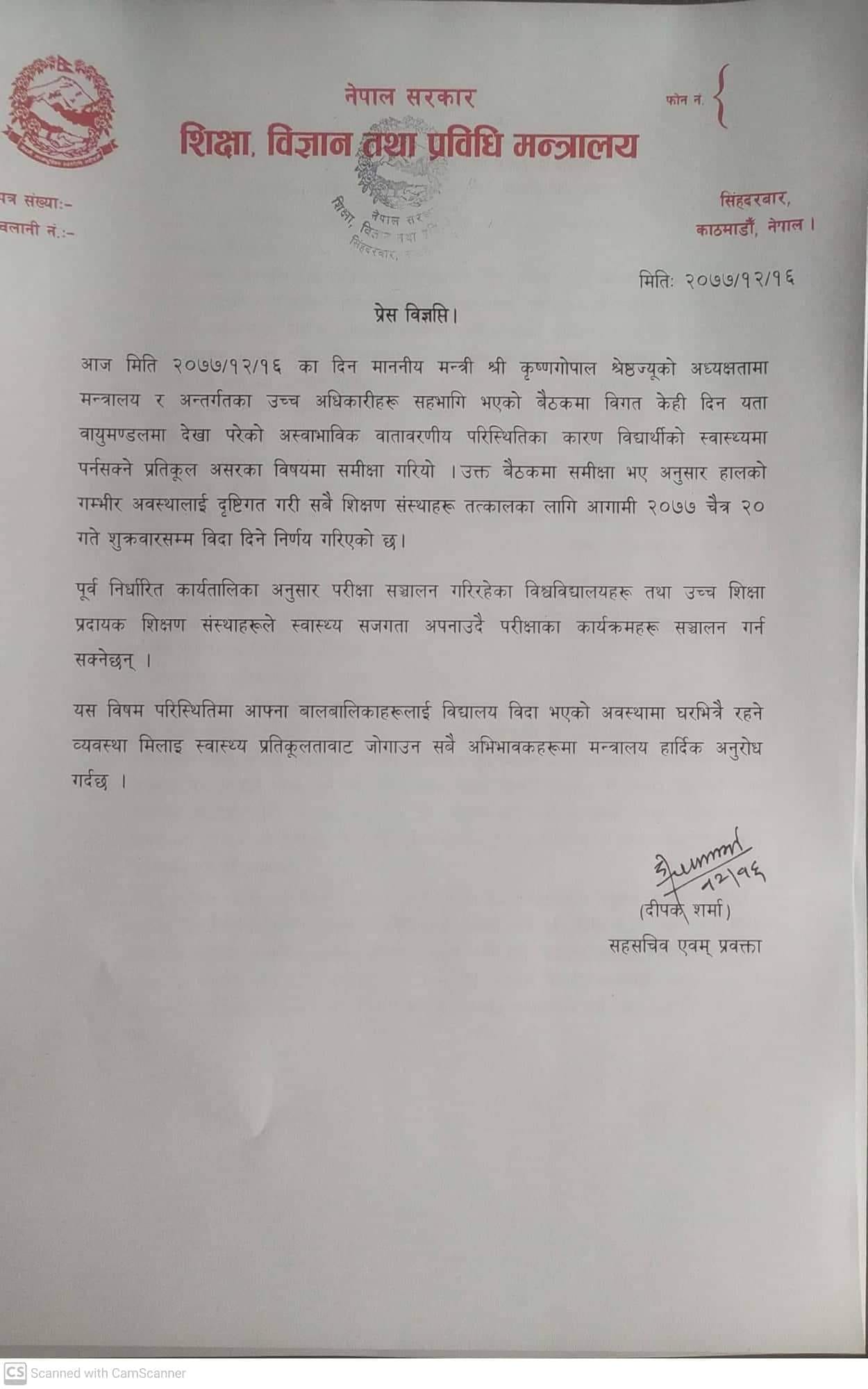 बैठकअघि मन्त्री श्रेष्ठले प्रधानमन्त्री केपी शर्मा ओलीसंग परामर्श गरेका थिए। लगत्तै मन्त्रालयमा भएको बैठकमा मन्त्री श्रेष्ठले लाखौ विद्यार्थीमा हुनसक्ने स्वाथ्य प्रतिकुलताको कारण सबै शिक्षणसंस्थता बन्द गर्नुपरेको बताए। बैठकले मंगलबारदेखि शुक्रबारसम्म सबै शिक्षण संस्था बन्द गर्ने गर्ने निर्णय गरेको मन्त्रालयका प्रवक्ता शर्माले बताए।