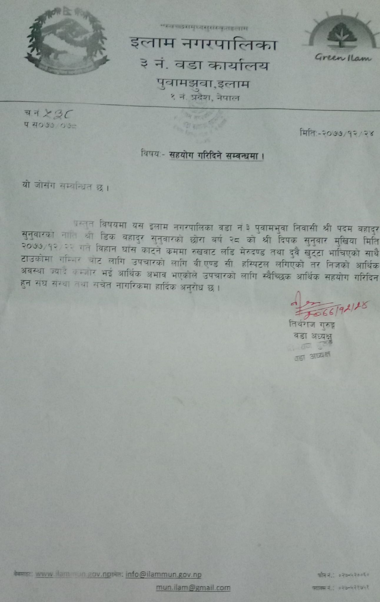 इलाम । घाँस काट्ने क्रममा खर्सुको रुखबाट लडेर गम्भिर घाइते भएका इलाम नगरपालिका ३ पुवामझुवाका दिपक सुनुवारको थप उपचारमा समस्या भएको छ । सुनुवारको झापास्थित वि एण्ड सी टिचिङ्ग अस्पतालको आइसीयुमा उपचार गराईरहेको उनलाई आर्थिक अभाव भएपछि उपचारमा समस्या भएको हो ।
